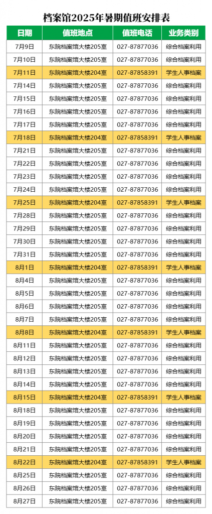 3.值班地点:武汉市洪山区珞狮路205号武汉理工大学马房山校区东院档案馆大楼204、205室(工作日周一至周四在205室,周五在204室)。